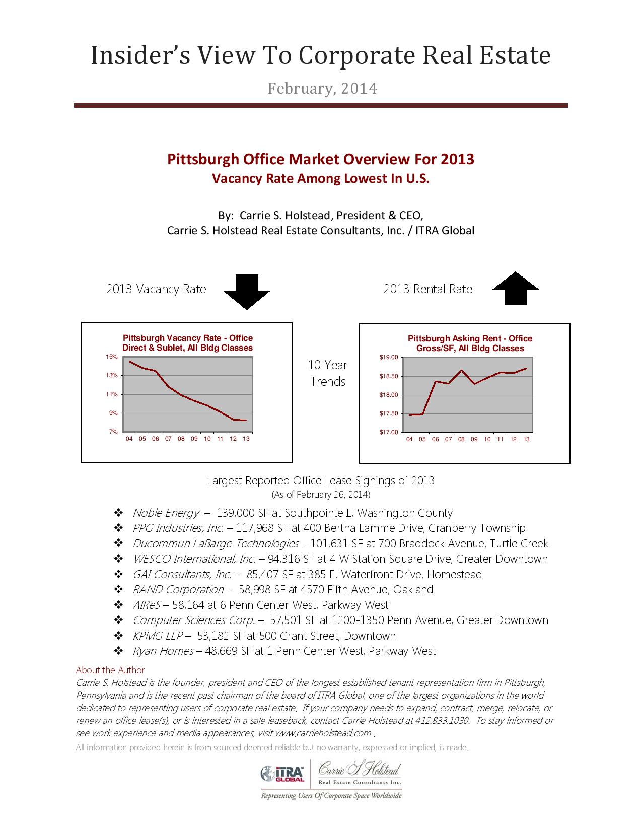 PITTSBURGH — (May 20, 2013) — Carrie S. Holstead, President and CEO of Carrie S. Holstead Real Estate Consultants, Inc./ITRA Global and Immediate Past Chairman … Read More