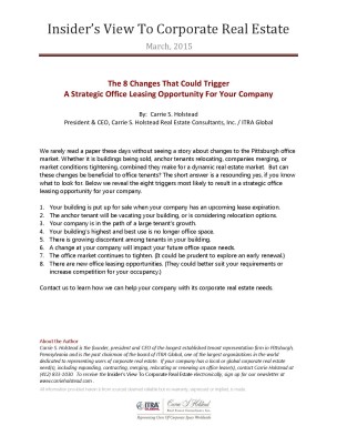We rarely read a paper these days without seeing a story about changes to the Pittsburgh office market. Whether it is buildings being sold, anchor tenants relocating, companies merging, or market conditions tightening, combined they make for a dynamic real estate market. But can these changes be beneficial to office tenants? The short answer is a resounding yes, if you know what to look for. Below we reveal the eight triggers most likely to result in a strategic office leasing opportunity for your company.