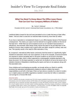 Since mistakes and overcharging are possible, we strongly advise our clients to carefully scrutinize the restoration (reinstatement) schedule to ensure it reflects the tenant’s responsibilities as set forth in the lease. When we have done so recently for a client in London, our in-depth analysis and skillful negotiations resulted in more than $2 million in restoration cost savings for a Fortune 500 client.